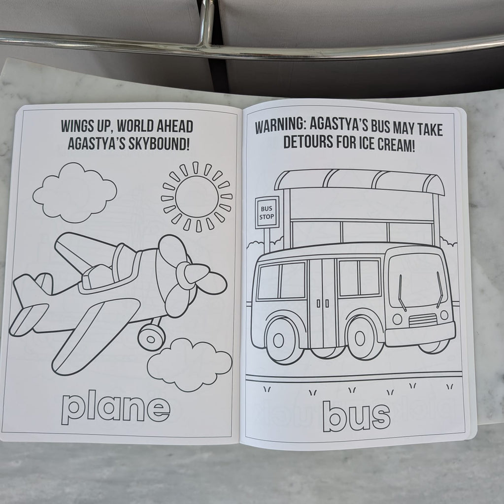 Zoom through the skies, dive under the sea, and roll down winding roads with this action-packed colouring book! From diggers and fire engines to hot air balloons and rockets, each page features a different vehicle theme with your child’s name cleverly woven into the artwork. A thrilling and personalised adventure for kids who love all things that go!