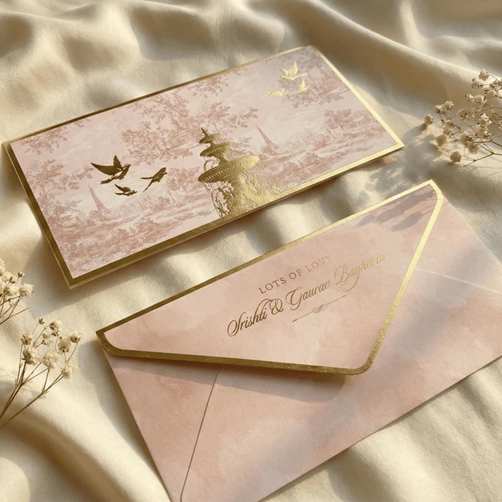 Bring a touch of romance to every celebration with our Royal Fountains themed Shahi Baug luxury envelopes. Inspired by timeless royal gardens, this design features a gold-foiled fountain, soaring doves, soft toile artwork and a blush pastel canvas — creating an aesthetic that feels elegant, emotional and unforgettable, making it perfect for festive and celebratory occasions. A sophisticated way to present your best compliments or cherished tokens. You can personalize with your name and greeting of choice printed in gold foiling. Suitable for use as Wedding money envelopes, Gift envelopes, Custom shagun envelopes, envelopes for gifting cash on birthdays, anniversaries, baby showers or any special occasion.
