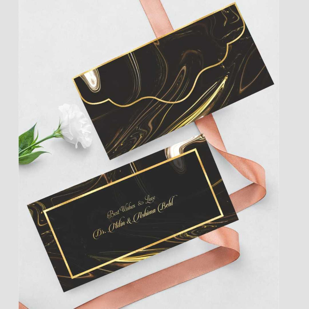 Elevate your wedding celebrations with our exquisite black and gold wedding cards, designed to impress. These luxe money envelopes feature stunning gold foiling, personalized with your name and heartfelt greeting, complemented by elegant gold motifs that embody a cosmic elegance theme. Perfect for adding a touch of sophistication to your special day, these custom shagun envelopes are a beautiful blend of style and sentiment.