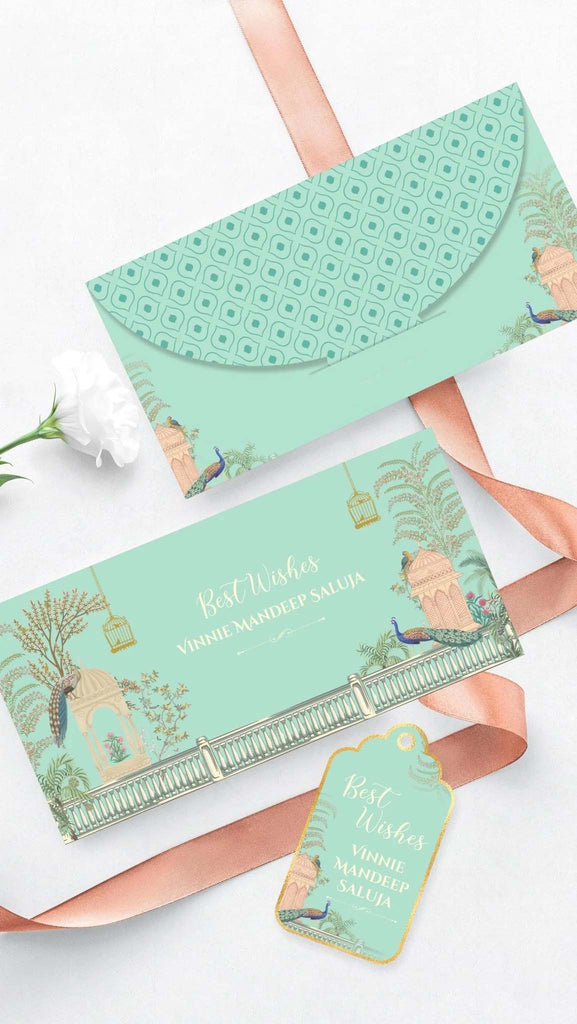 Our exquisite green money envelopes adorned with elegant gold lettering and a captivating peacock theme are designed to make a statement. Each envelope is personalized with stunning gold lettering, making it a truly luxurious and unique way to present money or gift cards. You can personalize with your name and greeting of choice printed in gold foiling. Suitable for use as Wedding money envelopes, Gift envelopes, Personalised shagun envelopes, envelopes for gifting cash on birthdays, anniversaries, baby showers or any special occasion.