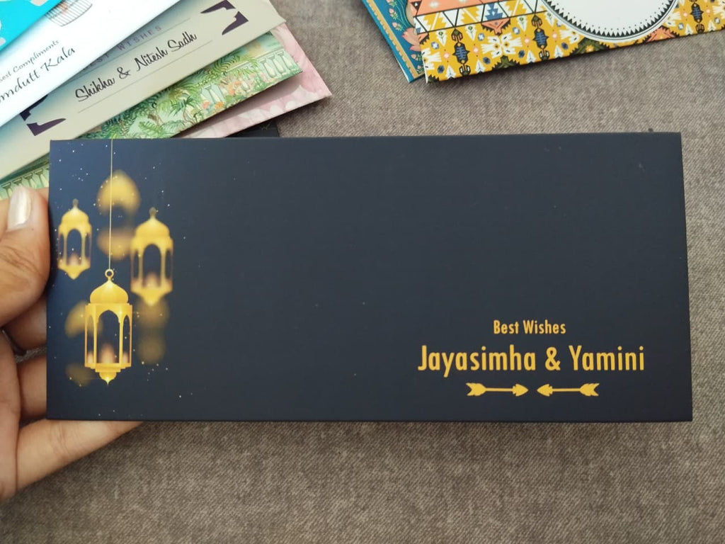 Hand holding a lanterns theme envelope with gold text against a green leafy background