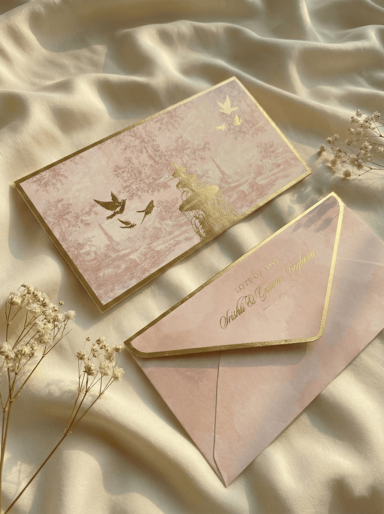 Bring a touch of romance to every celebration with our Royal Fountains themed Shahi Baug luxury envelopes. Inspired by timeless royal gardens, this design features a gold-foiled fountain, soaring doves, soft toile artwork and a blush pastel canvas — creating an aesthetic that feels elegant, emotional and unforgettable, making it perfect for festive and celebratory occasions. A sophisticated way to present your best compliments or cherished tokens. You can personalize with your name and greeting of choice printed in gold foiling. Suitable for use as Wedding money envelopes, Gift envelopes, Custom shagun envelopes, envelopes for gifting cash on birthdays, anniversaries, baby showers or any special occasion.