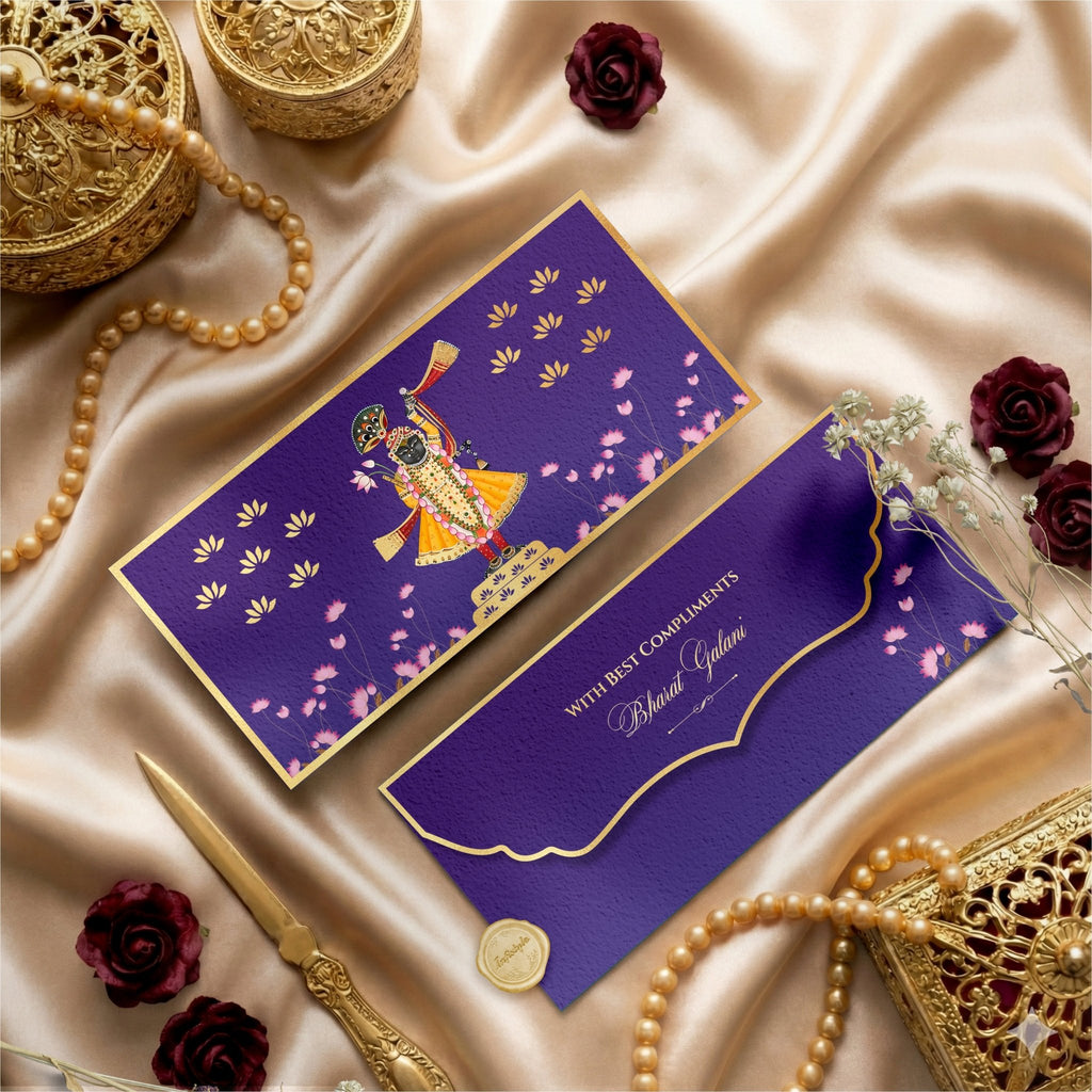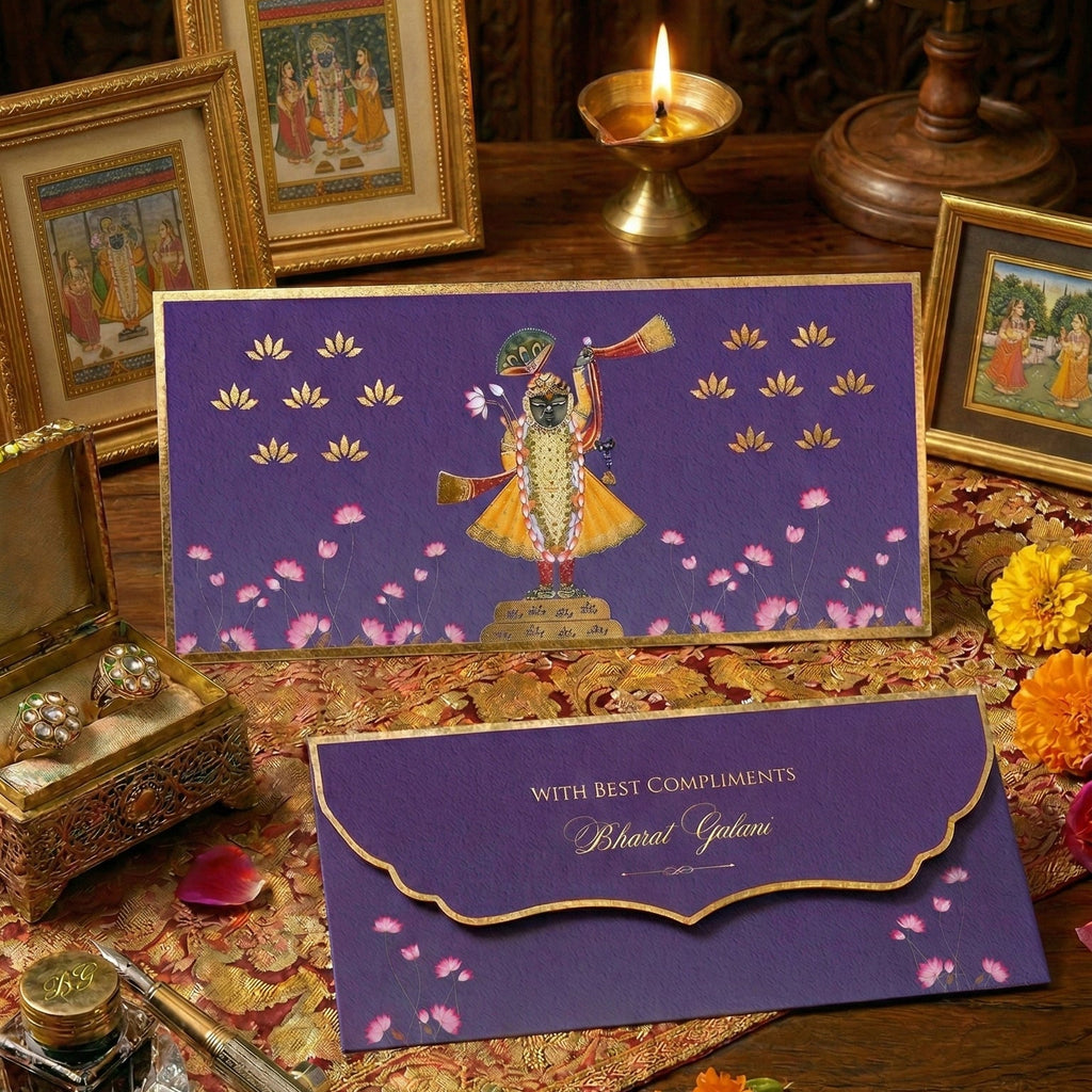 Celebrate tradition with our Shreenath Lotus Luxe envelope, featuring an intricate illustration of Lord Shreenathji surrounded by blooming lotuses. Accented with subtle gold foiling and a scalloped flap, this regal purple design brings a divine charm to every gift. Perfect for weddings, shagun, or festive blessings. A sophisticated way to present your best compliments or cherished tokens. You can personalize with your name and greeting of choice printed in gold foiling. Suitable for use as Wedding money envelopes, Gift envelopes, Custom shagun envelopes, envelopes for gifting cash on birthdays, anniversaries, baby showers or any special occasion.